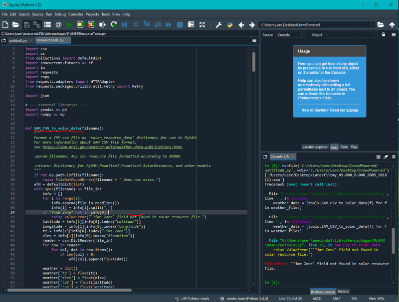 Attached you can find an image of my code which was taken from the PySAM tutorial, and the ResourceTools section that is causing the problem in my code.