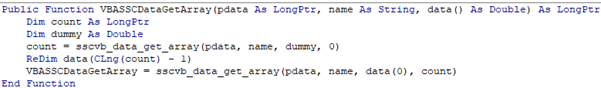 Thanks for the feedback, I tried using the function definition available in VBA, but was not able print output for VBASSCDataGetArray (p_data, name, data(0), count).