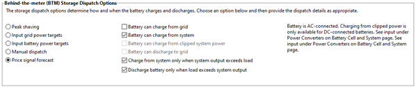 In this case, you can see from the disabled inputs for the Price Signal Forecast dispatch option on SAM's Battery Dispatch page for a behind-the-meter battery that charging from the grid is allowed, but discharging to the grid is not allowed. The text to the right of the inputs provides some additional information: