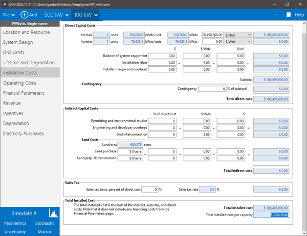 One way to to simplify the cost inputs in SAM is to use the Module cost to represent the system cost. For example, for the 100 MW system in your analysis, the total installed cost in SAM is $106,498,000.00 or $1.06/Wdc. You could set all of the cost inputs to zero except for the Module cost to zero like this: