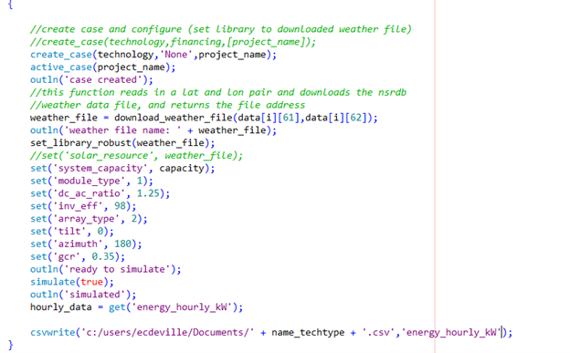 I've got everything working except for the simulate and save portion of this task. I'm having issues getting the simulate(); function to work in my script (attached). I can see in SAM when I run the script that the weather file is being chosen, that the system size, module type, dc to ac ratio, etc., are all being updated correctly. The output bar shows that the simulation(); part of the script is running. And a .csv file is being saved in the spot I'm telling it to save the 8760 data, but for some reason, it doesn't look like anything was simulated in SAM and there is nothing in the results file.